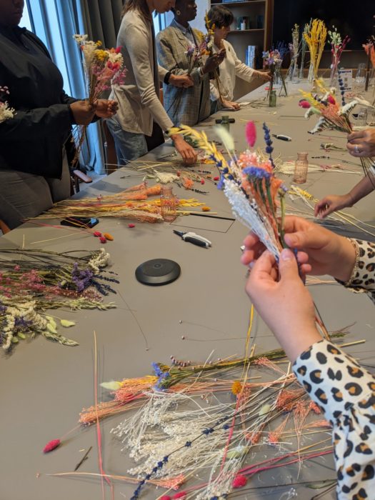 Un premier point d’explication : lorsque je parle de fleurs séchées, j’évoque l’ensemble des fleurs qui ne fanent pas, j’y englobe donc les fleurs et feuillages stabilisés. Ces derniers végétaux ont conservé leur souplesse grâce à la technique de stabilisation par laquelle ils sont passés et se prêtent ainsi particulièrement bien à la création minutieuse de ces accessoires cheveux.